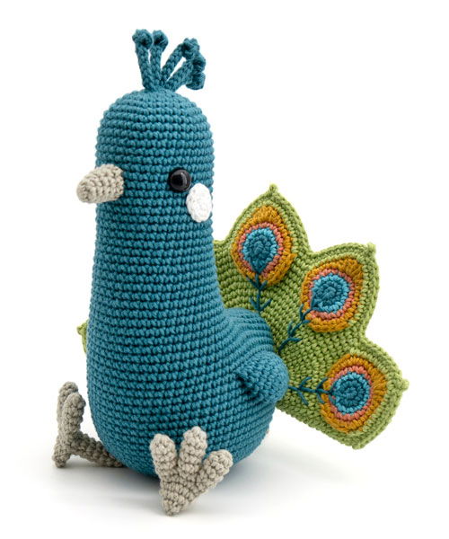 Haakpatroon van pauw Argo, Argo ontvouwt zijn magnifieke veren als een prachtige waaier. De pauw is gehaakt van het garen Ricorumi DK, en is circa 23 cm groot.