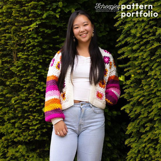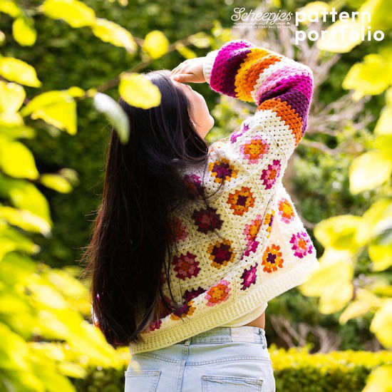 Scheepjes haakpatroon Petal Patch Cardigan. Het vest is een kleurrijk en creatief kledingstuk dat klassieke haaktechnieken viert. Het vest is gemaakt met tijdloze granny squares en gestreepte patronen, waardoor het perfect is voor beginnende haakliefhebbers die hun vaardigheden willen oefenen met een leuk en draagbaar project.