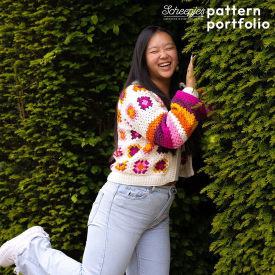 De granny squares worden aan elkaar gezet om het lichaam van het vest te vormen, terwijl de mouwen bestaan uit eenvoudige gestreepte granny-patronen. Het vest wordt compleet gemaakt met een rekbare geribde rand bij de zoom, hals en manchetten. Het vest is gehaakt van Scheepjes Colour Crafter.