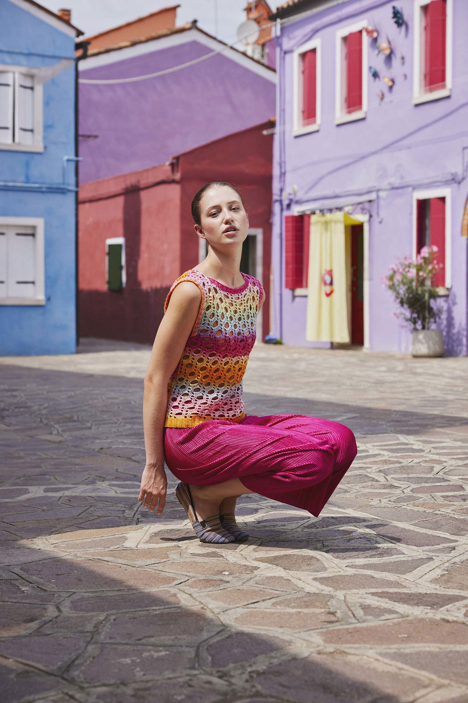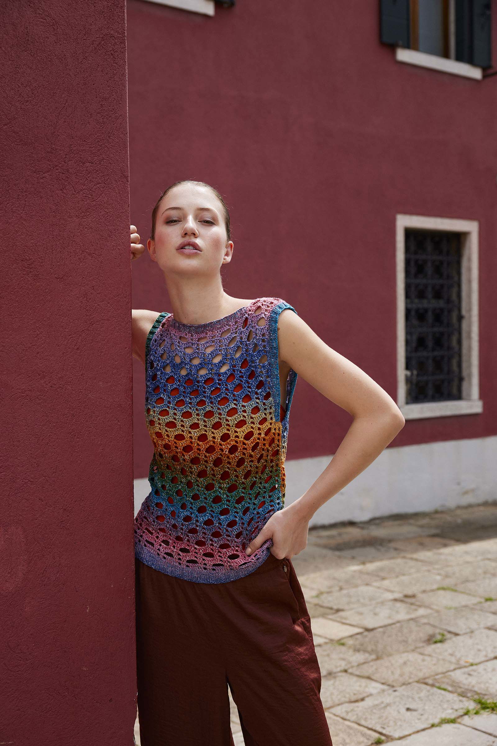 Voor het Dameshemdje Poppy wordt gewerkt met Lang Yarns Quattro Degrade 1088, een garen dat bekend staat om zijn superieure kwaliteit en prachtige effecten. Dit gemerceriseerde katoen garandeert niet alleen duurzaamheid, maar ook een verfijnde glans die het doorkijk gatenpatroon extra cachet geeft. De kleuren van Quattro Degrade lopen op een verrassende en vloeiende manier in elkaar over, wat elk project een werkelijk unieke en artistieke uitstraling bezorgt. Dit garen is de perfecte keuze om de details van de grote ronde open cirkels te accentueren en de algehele elegantie van de mouwloze top te versterken.