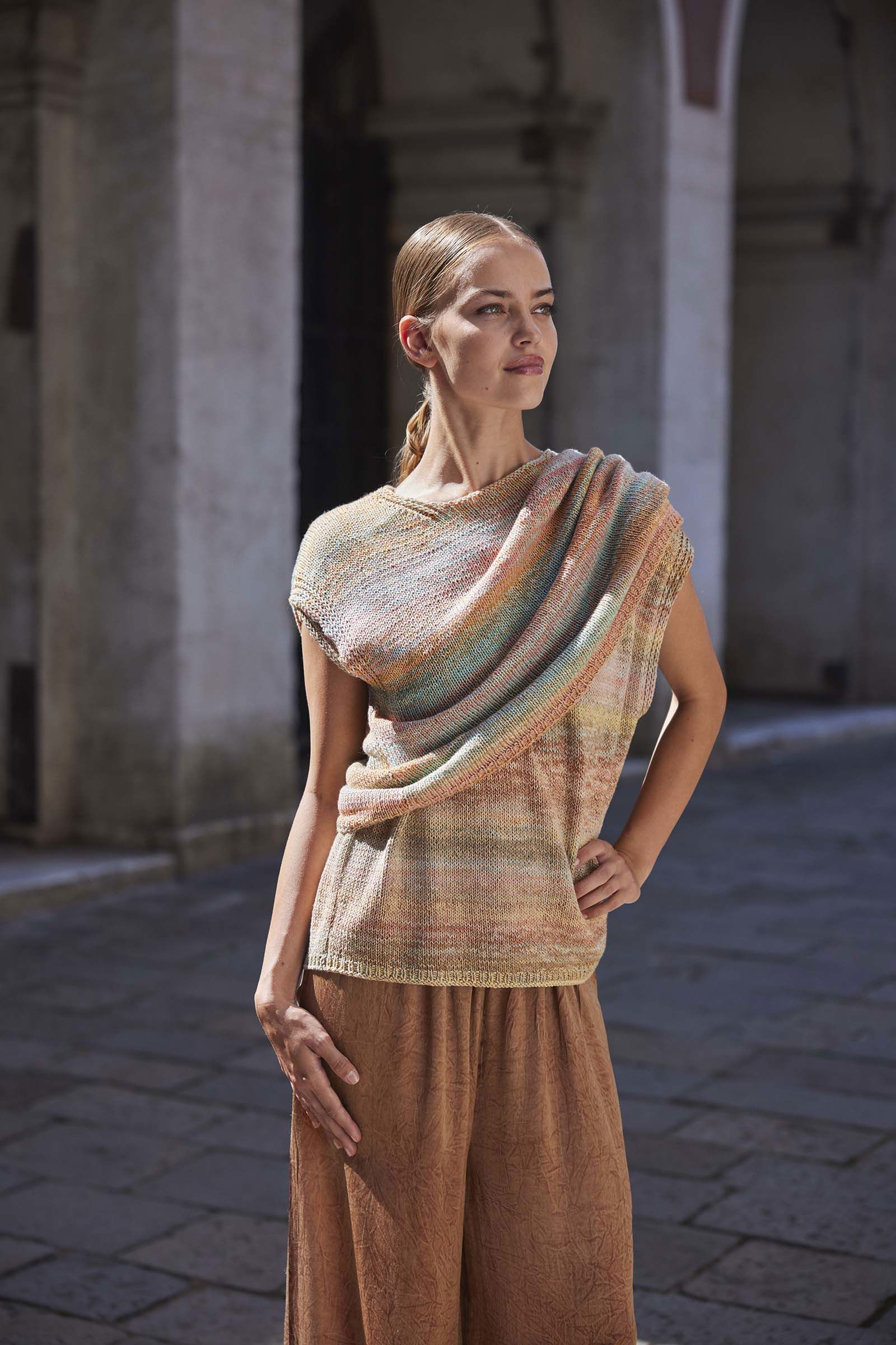 Voor het damesshirt Georgina wordt gewerkt met Lang Yarns Illusion, een garen dat staat garant voor een uitzonderlijk resultaat. Deze bijzondere mix van katoen en bamboeviscose voelt niet alleen heerlijk zacht aan op de huid, maar verrast ook met zijn unieke kleurpatroon. Elke afzonderlijke draad wordt vóór het twijnen bedrukt met een identiek kleurverloop, wat resulteert in een continu wisselend kleurenspel binnen het garen. Bij het breien ontstaat hierdoor een fascinerend mouliné-effect dat doet denken aan een sprankelende illusie of een fata morgana. Het eindresultaat is een stof met een gelijkmatige kleurverdeling die toch dynamisch en levendig oogt, perfect om jouw creatie een betoverende uitstraling te geven.