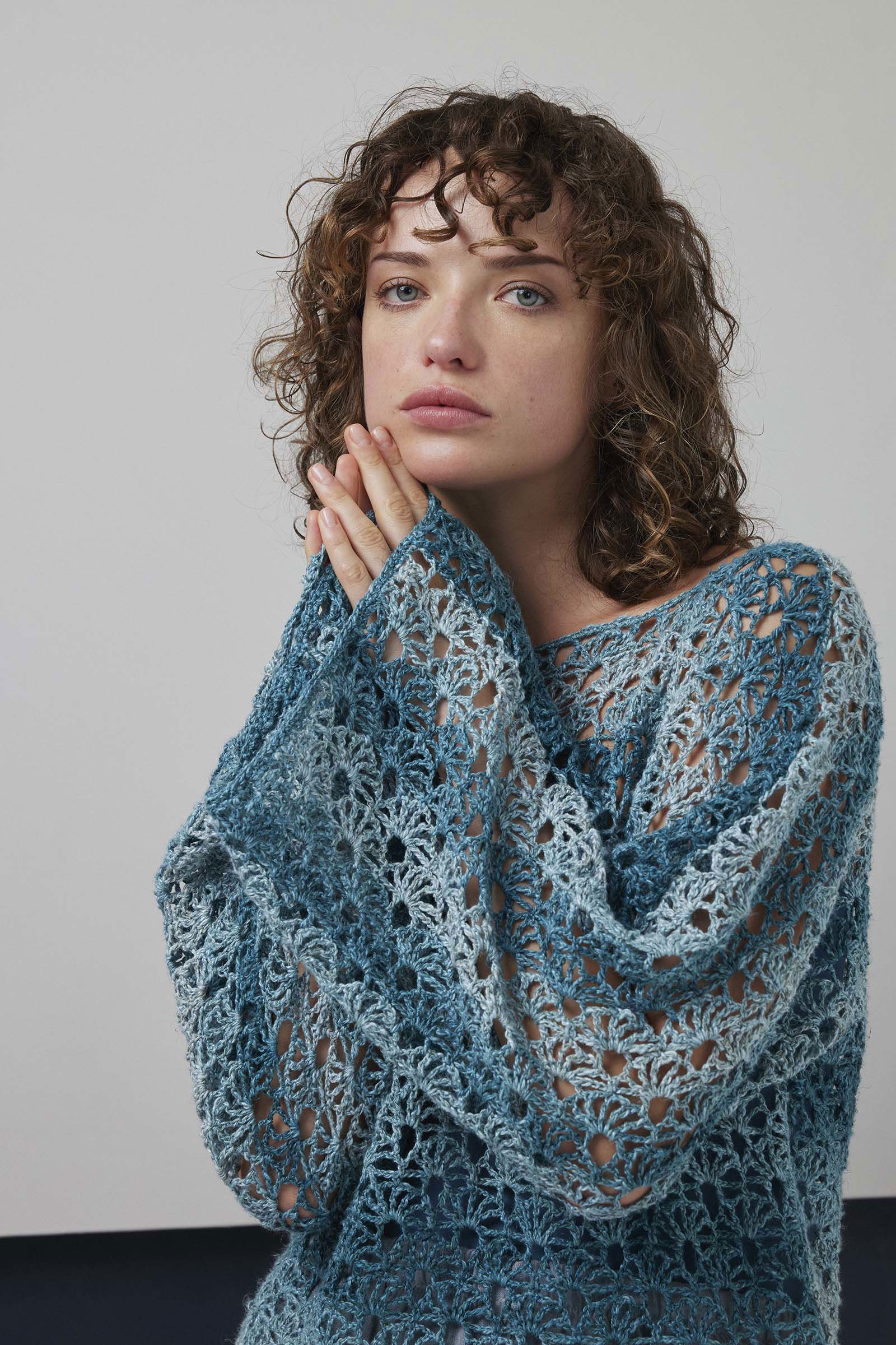 Lang Yarns haakpatroon Yumi, een in één stuk gehaakte trui met rechte halslijn. Deze wijde trui is gehaakt in open haakwerk met waaierpatroon. Het garen Lang Yarns Linelle geeft de trui fraaie nuances.