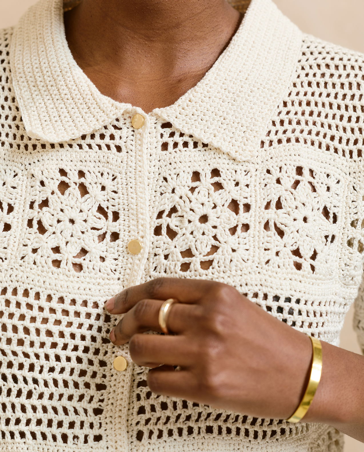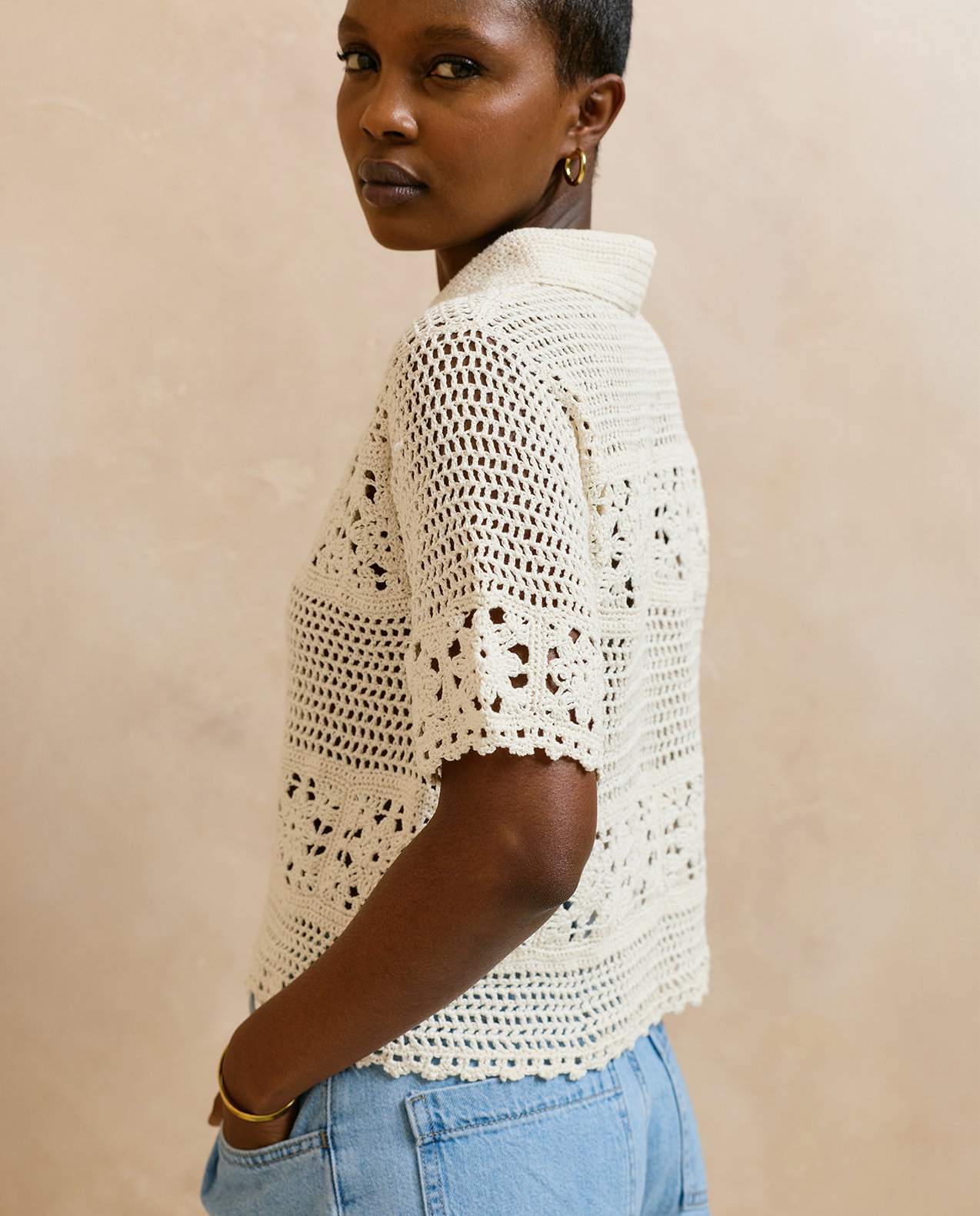 Phildar haakpatroon Polo Hanna, damesvest met korte mouwen, kraagje en knoopsluiting. Dit in brede banen gehaakte shirt , heeft haar natuurlijke uitelijk te danken aan het garen Phil Origin.