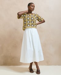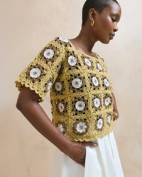 Phildar haakpatroon trui Helena, met vierkante hals. De korte mouwen zijn met een boogjes patroon afgewerkt. Dit in vierkanten gehaakte shirt, is gehaakt met het garen Phil Perle 5.