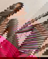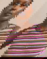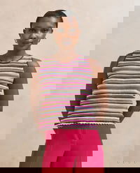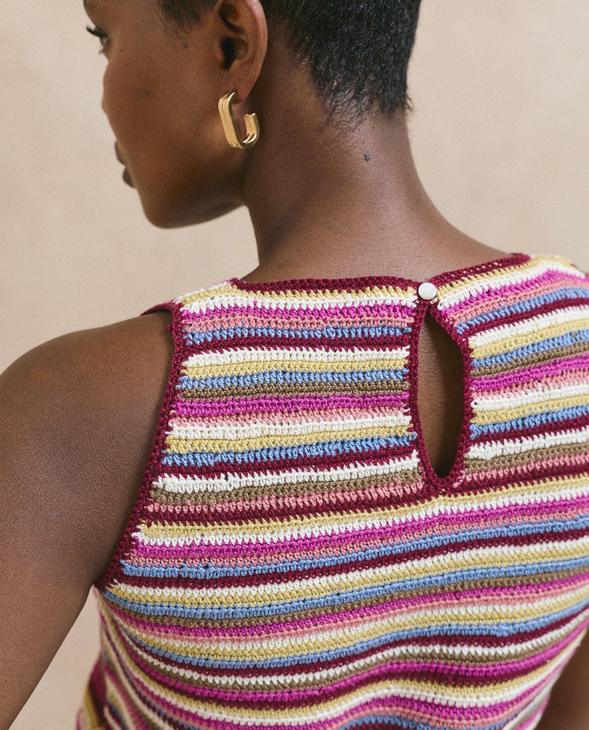 Phildar haakpatroon Holly, gestreepte damestop met ronde hals. Dit meerkleurige hemdje is aan de onderkant afgewerkt met een muizentand rand.