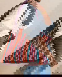 Phildar haakpatroon Hiloé, verticaal gestreepte tas met brede schouderbanden. Deze shopper is gehaakt van verschillende garens, welke varieëren in structuur en uitelijk.