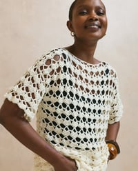 Phildar haakpatroon Iris, een in fantasie patroon gehaakte damestrui met korte mouwen. Dit doorkijk shirt, is gehaakt van het garen Phil Koala.