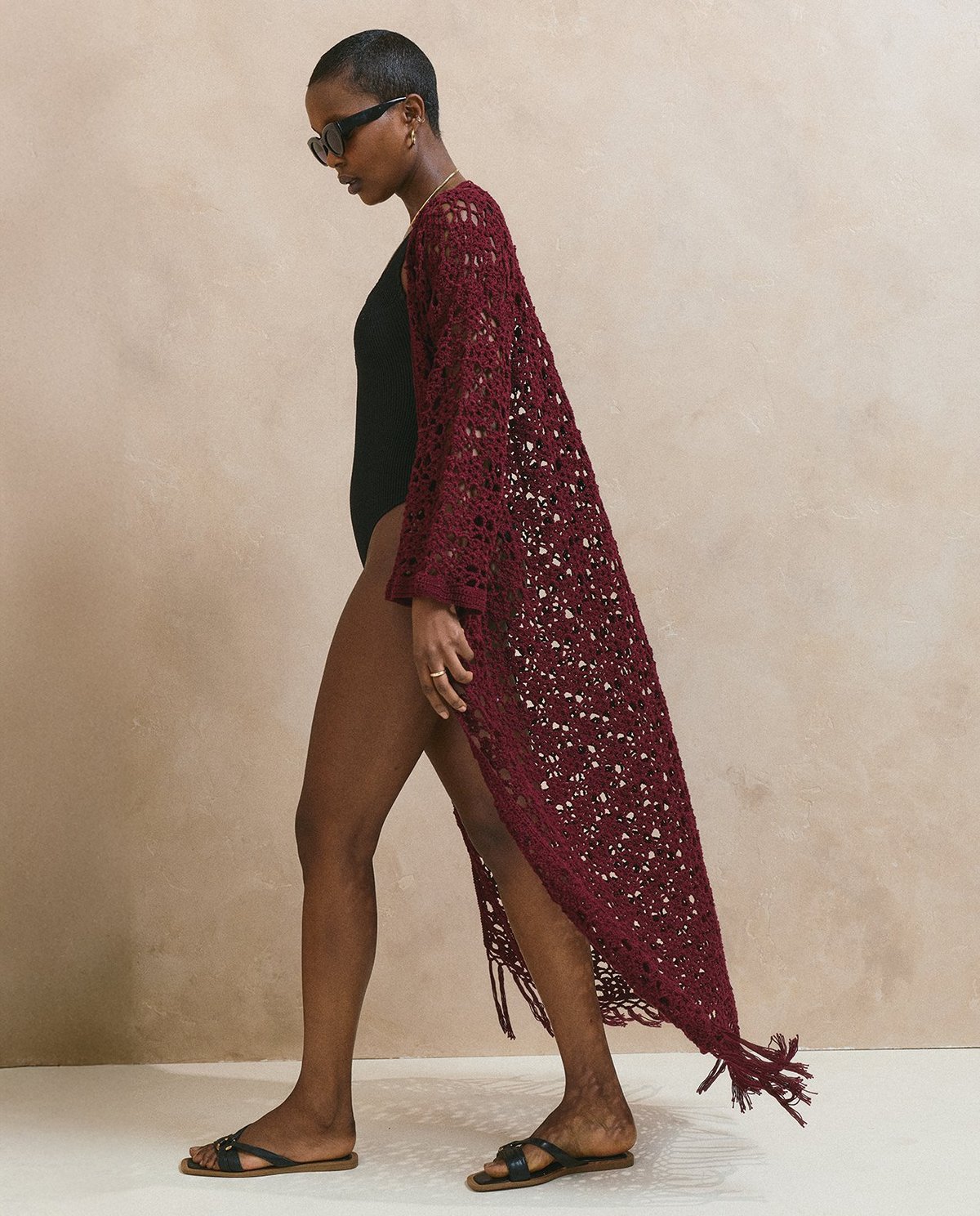 Phildar haakpatroon Honoré, opengehaakt damesvest met franjes aan de onderrand. Dit extra lange vest is gehaakt in een open haakpatroon, met het garen Phil Coton 3.