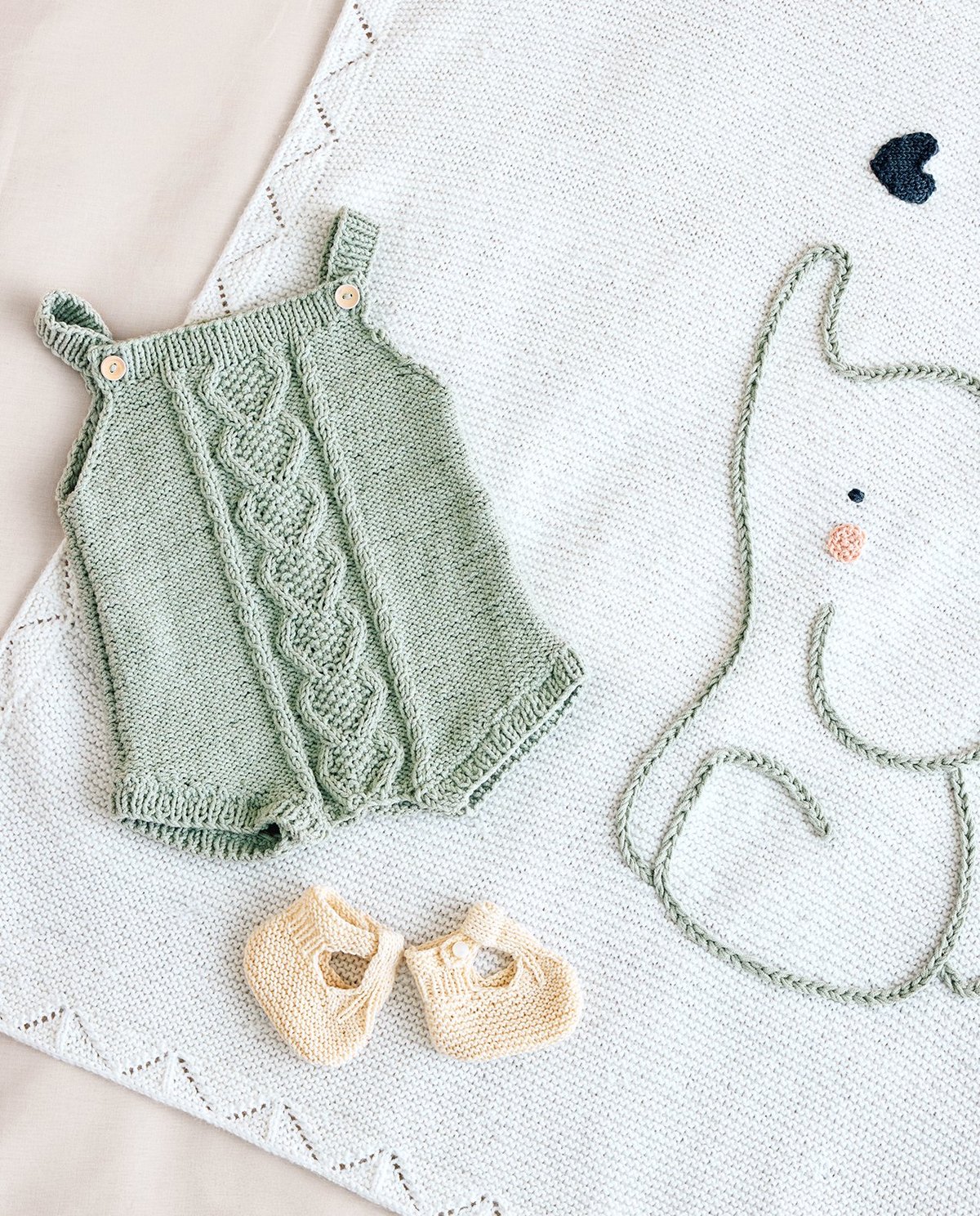 Phildar breipatroon speelpakje ëmilio, met smalle schouderbandjes. Deze in ribbelsteek en kabelpatroon gebreide romper, is gemaakt van het garen Phil Cabotine.