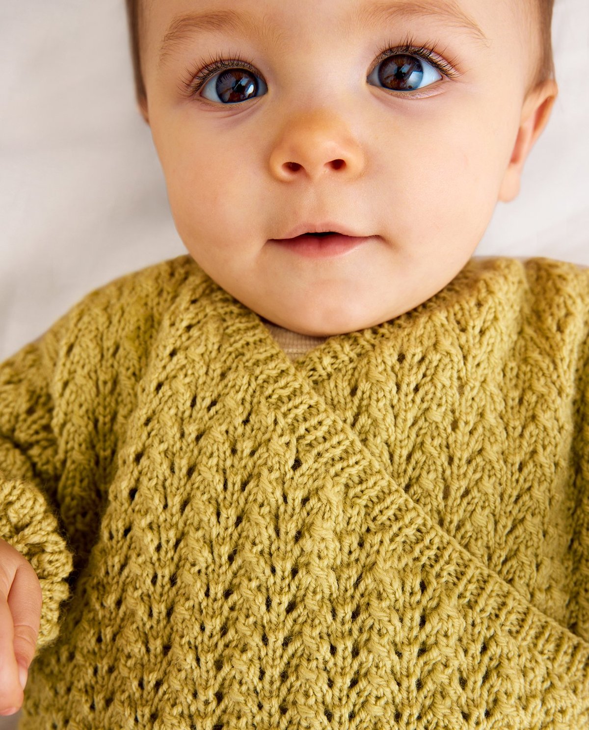 Phildar breipatroon luiertruitje Éloïse, met dubbele overslag welke met strikkoord wordt vastgemaakt. Dit vestje is gebreid in ajourpatroon, met het garen Phil Super Baby.