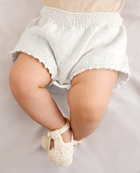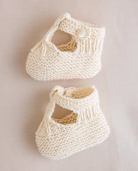 Phildar breipatroon babyslofjes Élizée, met open voorkantjes en enkelriempjes met knoopsluiting. Deze schoentjes met ronde neus, zijn gemaakt met het garen Phil Cabotine 3.