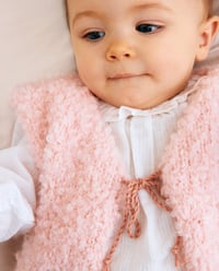 Phildar breipatroon Emma, mouwloos vestje met V-hals en strikkoordje. Dit gilletje is gemaakt van het garen Phil Alpaga Boucle, welke een tuig en stoer breiwerk geeft.