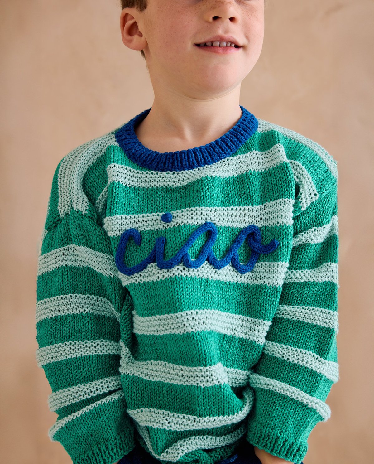 Phildar breipatroon trui Flavio, met gepunnikte tekst Chao. Deze in banen van tricot- en ribbelsteek jongenstrui, is gemaakt van het zachte garen Phil Soft Cotton.
