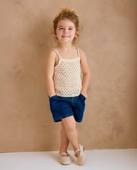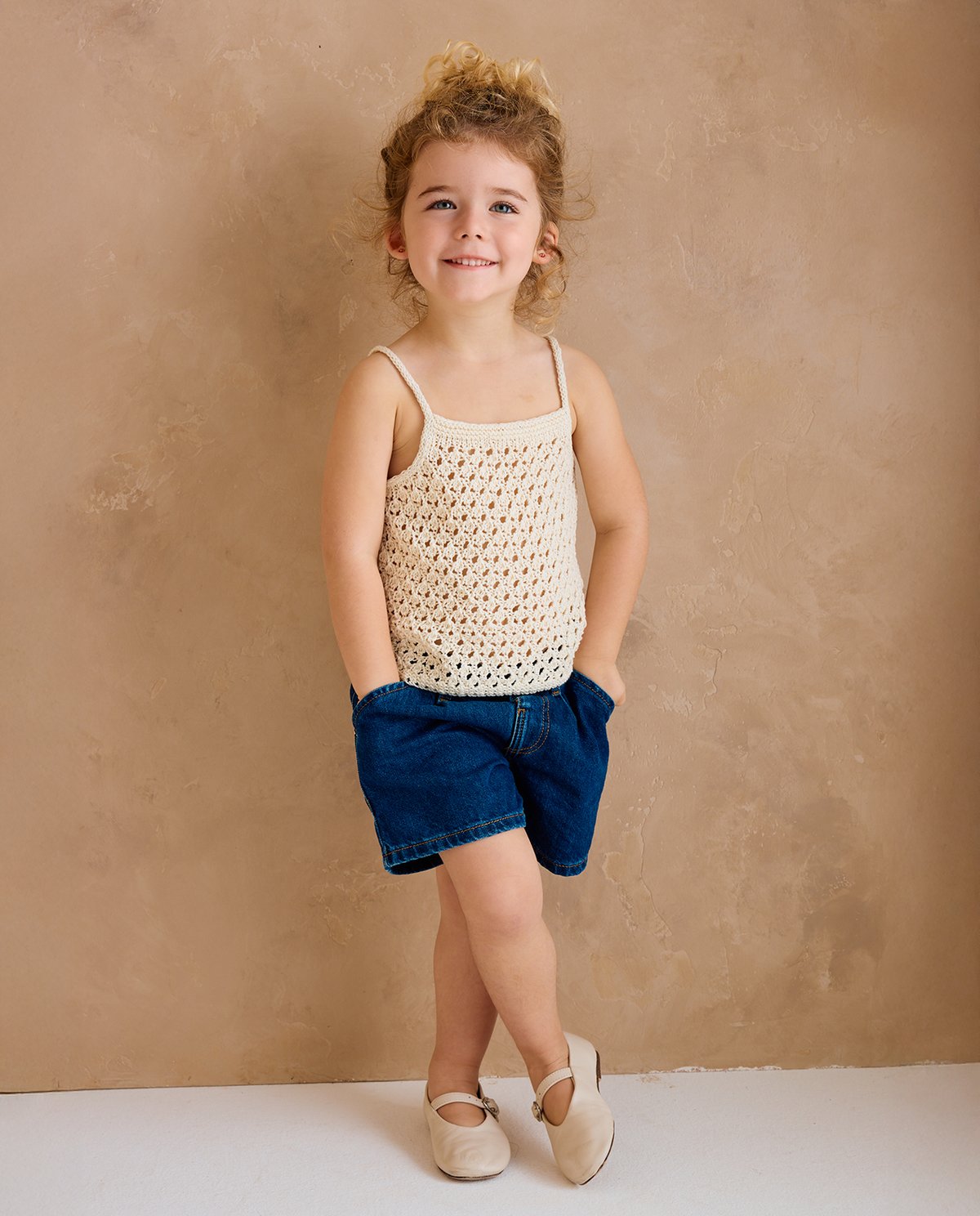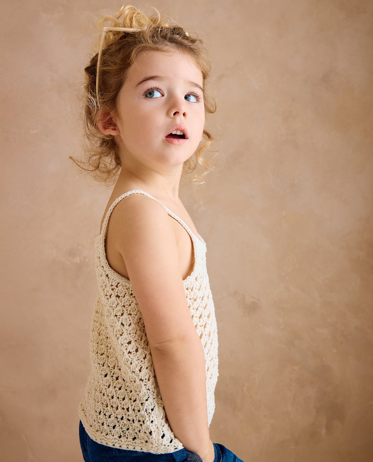 Phildar breipatroon Florina, topje voor meisjes met spaghettibandjes. Dit zomerse hemdje is gebreid in ajourpatroon, met het garen Phil Cabotine.