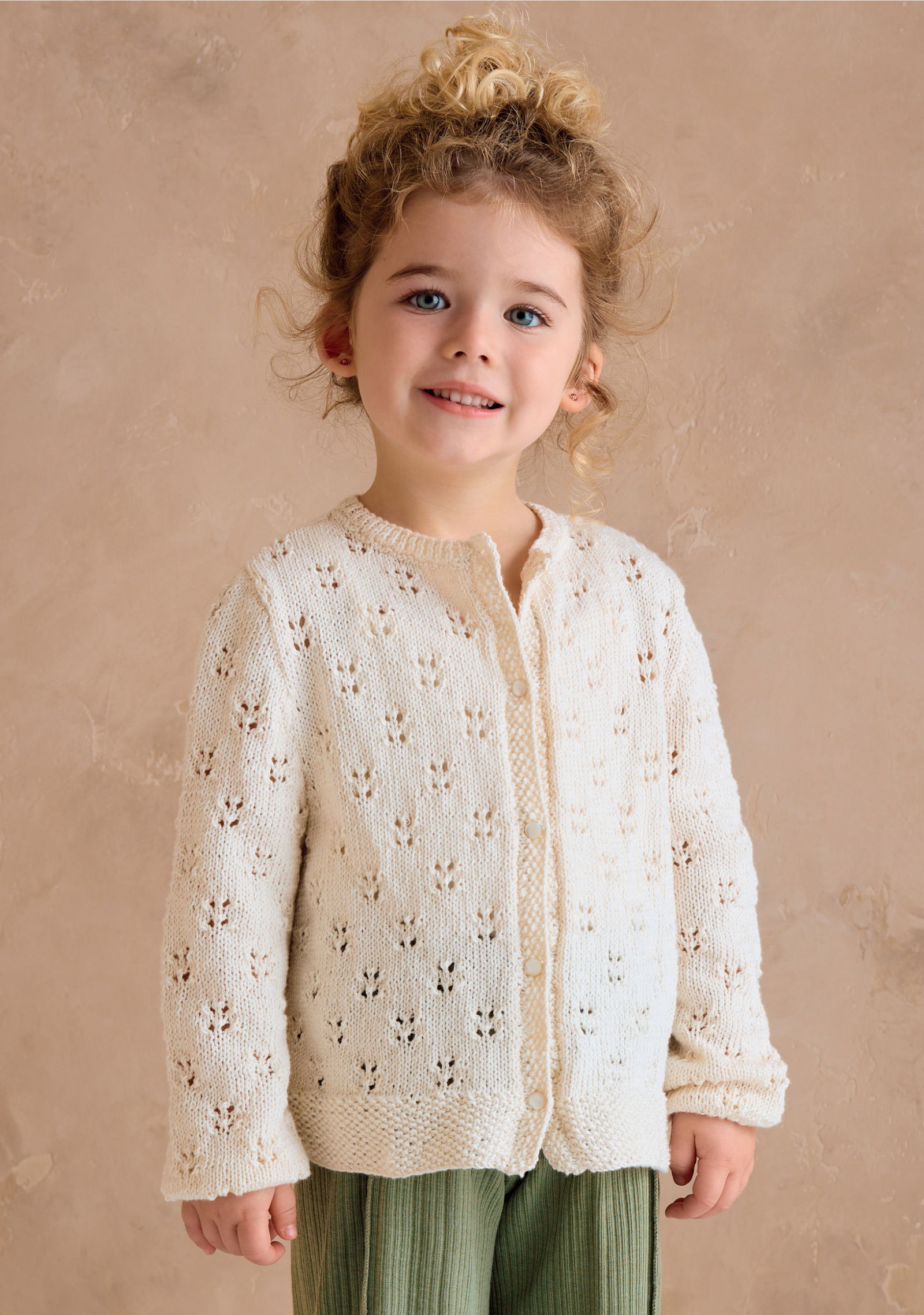 Phildar breipatroon Fanny, meisjesvest met ronde hals en knoopsluiting. Dit heerlijk zachte en fijne vestje, is gemaakt met het garen Phil Soft Cotton.