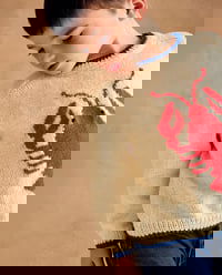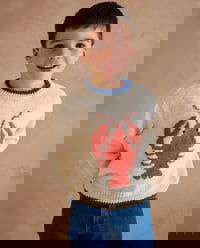 Phildar breipatroon Faustin, kindertrui met kreeft en in kleur afstekende randen. Deze trui is gebreid in tricotsteek, met het garen Phil Cabotine en Cotton 3.