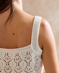 Phildar breipatroon Caly, zonnetopje met lage halslijn en brede schouderbanden. Dit in ajour patroon gebreide hemdje, is gemaakt et het garen Phil Soft Cotton.