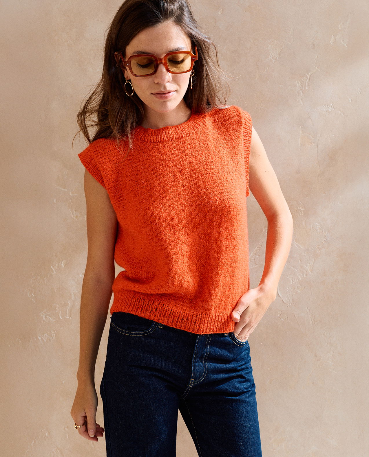 Phildar breipatroon top Olive, met ronde hals. Deze spencer is gebreid in tricotsteek met het garen Phil Baby Alpaga.