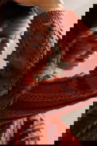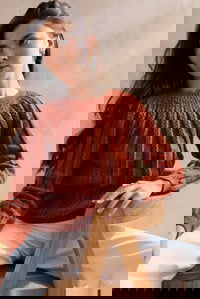 Phildar breipatroon Trui Clara, met verticale lijnen die als waaier over de trui verspreiden. Deze luxe trui van zijde en merinos is gemaakt van het garen Phil Soie Mérinos