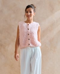 Phildar breipatroon vest Cleo, met knoopsluiting en ronde hals. Dit mouwloze damesvest heeft haar ruige uiterlijk te danken aan het garen Phil Alpaga Boucle, heerlijk zacht en warm.