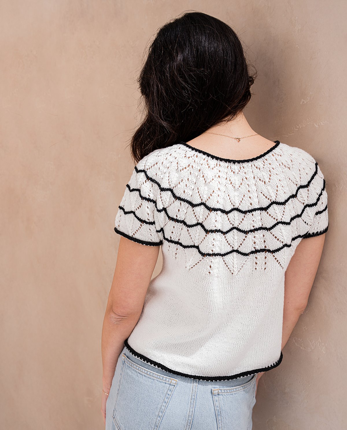 Deze elegante dames trui wordt volledig gebreid, met speciale aandacht voor de constructie van de verfijnde ronde pas. Het unieke kantpatroon, dat de ronde pas siert, wordt steek voor steek gecreëerd en krijgt extra karakter door de zorgvuldig ingebreide fijne zwarte lijnen. Dit project biedt een heerlijke brei-uitdaging en resulteert in een kledingstuk dat zowel comfortabel als stijlvol is.