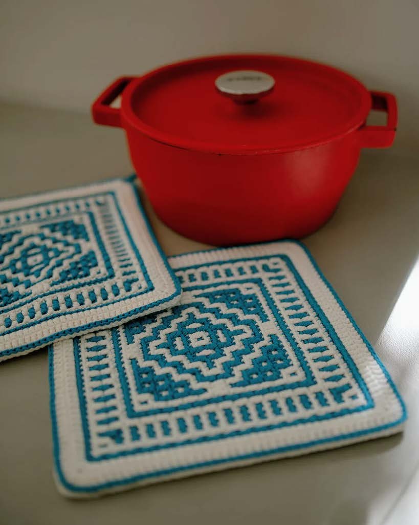 Mozaïek haakpatroon pannenlappen, afmeting circa 24 x 24 cm. De pannenlappen zijn gehaakt van het garen Scheepjes Cahlista.