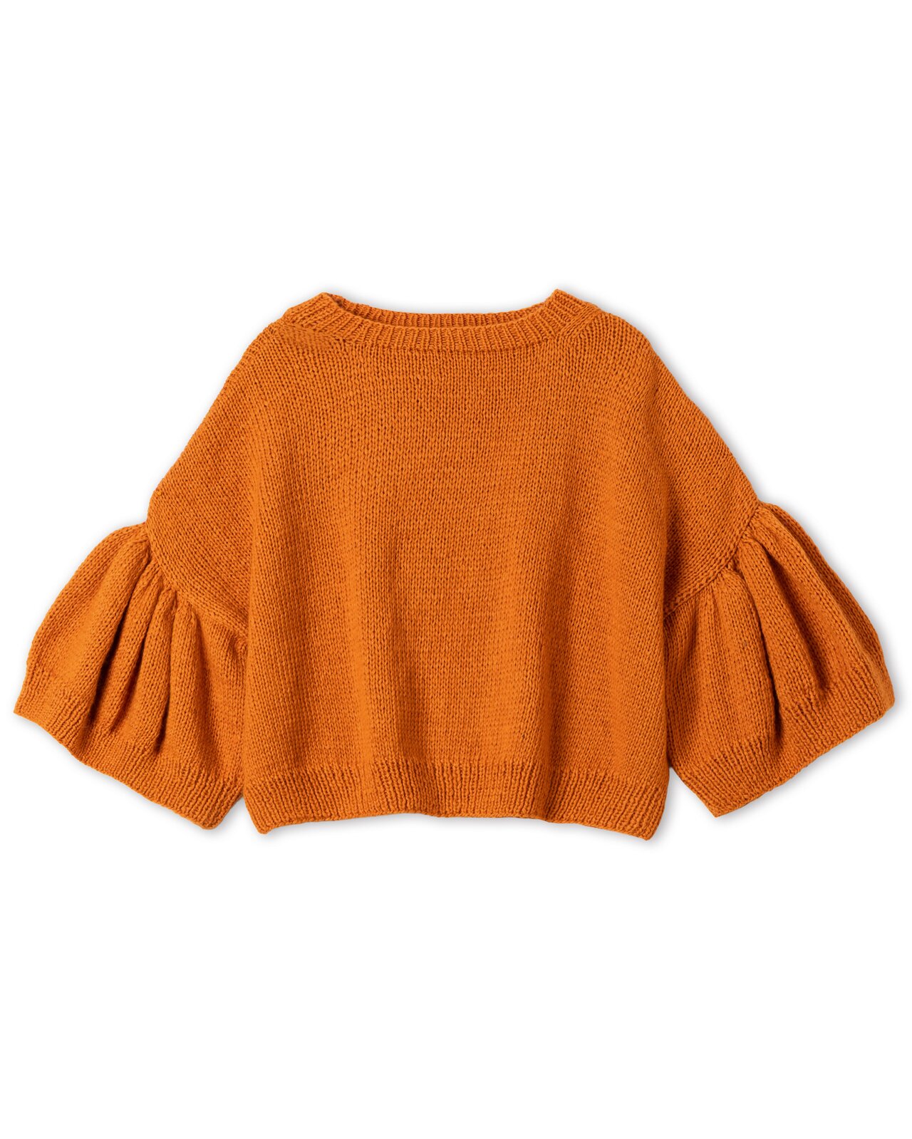 De trui wordt gebreid met de nadruk op een comfortabele pasvorm die naadloos aansluit bij de moderne esthetiek. De constructie van de laaghangende schouders creëert een ontspannen silhouet. De korte mouwen worden voorzien van een subtiele rimpeling aan de schouders, wat zorgt voor een verfijnde textuur en beweging. Een brede halsopening maakt het ontwerp af, ideaal voor een casual of gelaagde look.