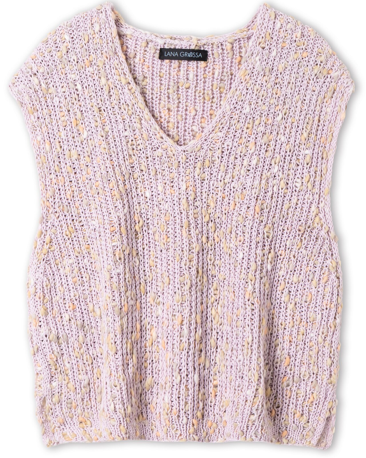 Geef uw garderobe een frisse impuls met deze elegante mouwloze damestrui met V-hals. Dit eigentijdse breipatroon transformeert hoogwaardig garen tot een veelzijdige spencer, perfect voor lagen of als opvallend solo-item. Ontdek hoe de bijzondere structuur van Lana Grossa Popcorn elk gebreid detail verrijkt, resulterend in een uniek kledingstuk dat comfort en stijl moeiteloos combineert.