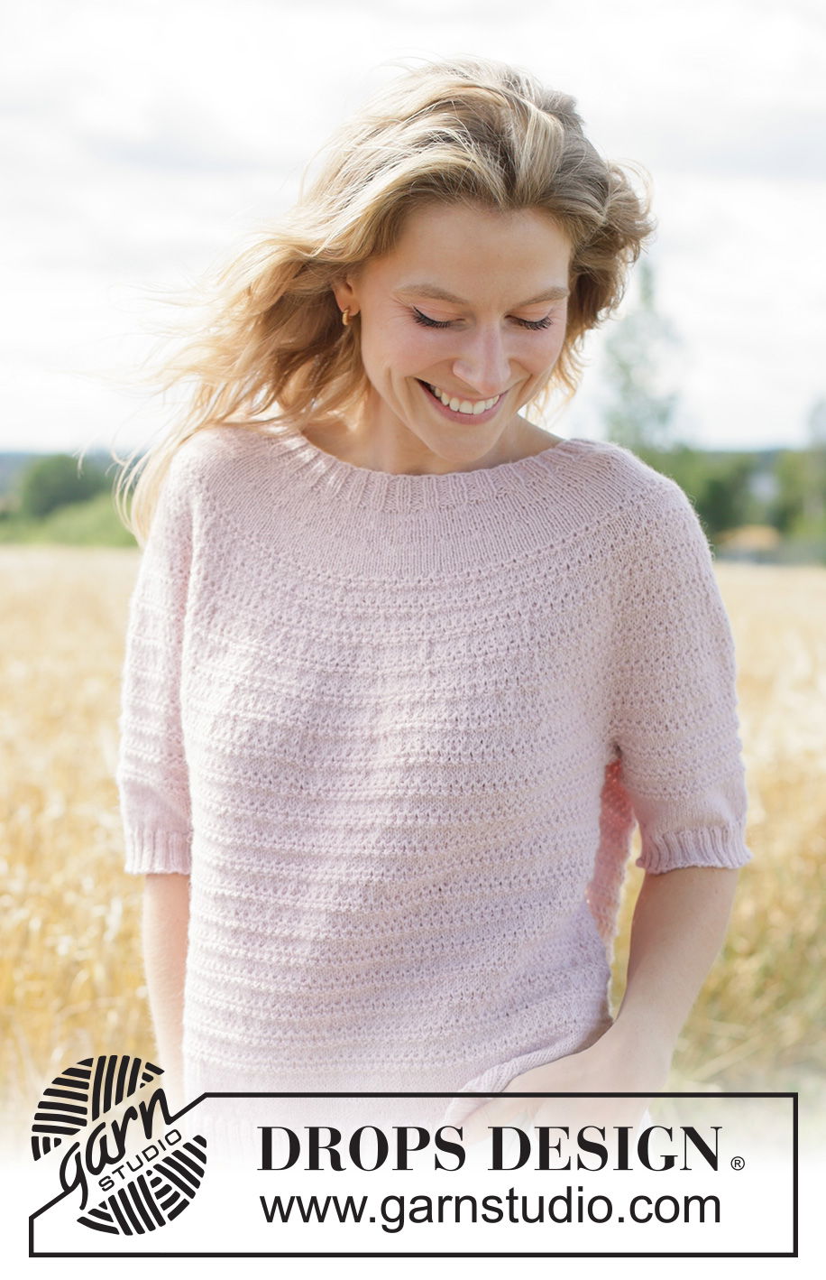 Rose Cloud Sweater, kenmerkt zich door een subtiel reliëfpatroon over het lijf en de korte mouwen, wat zorgt voor een verfijnde, wolkachtige textuur. Een perfecte, lichte damestrui voor elk seizoen.