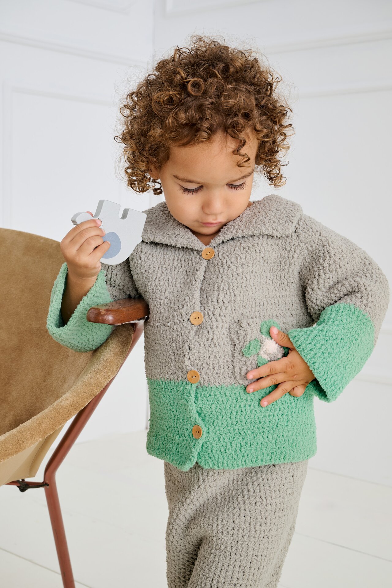 Met dit patroon haak je een prachtig jasje met een moderne tweekleurige esthetiek. De constructie omvat het zorgvuldig haken van de verschillende delen, inclusief de kraag, de mouwen en het opvallende borstzakje. De techniek van het haken biedt je de vrijheid om diverse steken te gebruiken, waardoor een comfortabele en duurzame pasvorm ontstaat die perfect is voor actieve peuters. De details, zoals het kleine schildpadje, worden apart gehaakt en bevestigd voor een mooie afwerking.