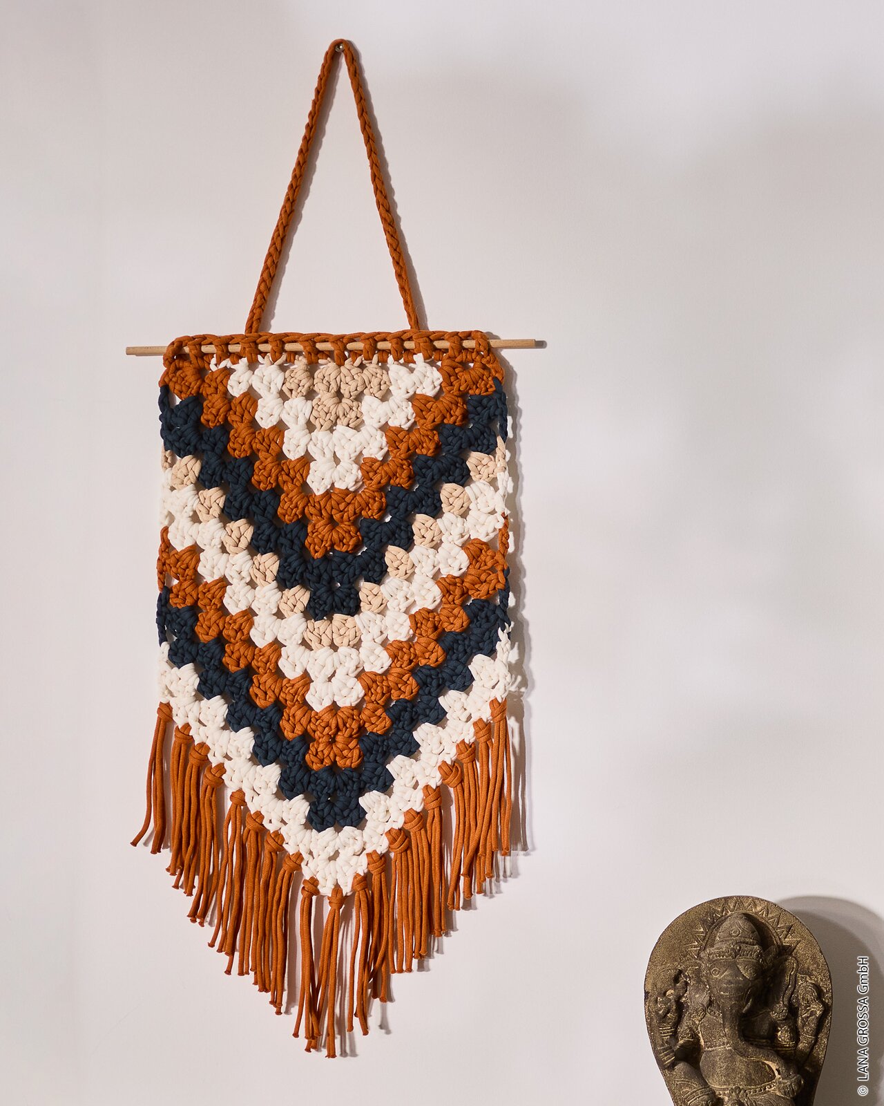 Voor dit project werk je met Lana Grossa The Tube, een uitstekende keuze voor interieurprojecten dankzij de unieke eigenschappen. Deze dikke tricotdraad zorgt voor een snelle voortgang en een prachtig, robuust textuur, ideaal voor een statement-stuk als deze wandhanger. De combinatie van katoen en nylon maakt het garen zowel comfortabel als duurzaam.