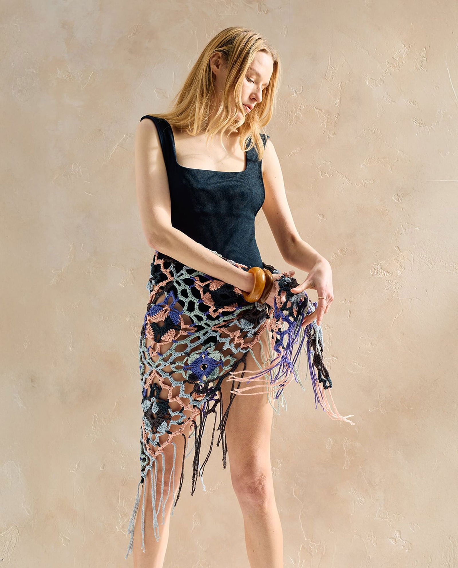 Ontdek het plezier van het haken van een prachtige omslagdoek, een ware blikvanger met zijn delicate openhaakwerk en vrolijke bloemmotieven. Deze kleurrijke, driehoekige sjaal wordt afgewerkt met lange, zwierige franjes, perfect om elke outfit een zomerse en speelse touch te geven. Een stijlvol accessoire dat zowel elegantie als handgemaakte charme uitstraalt.