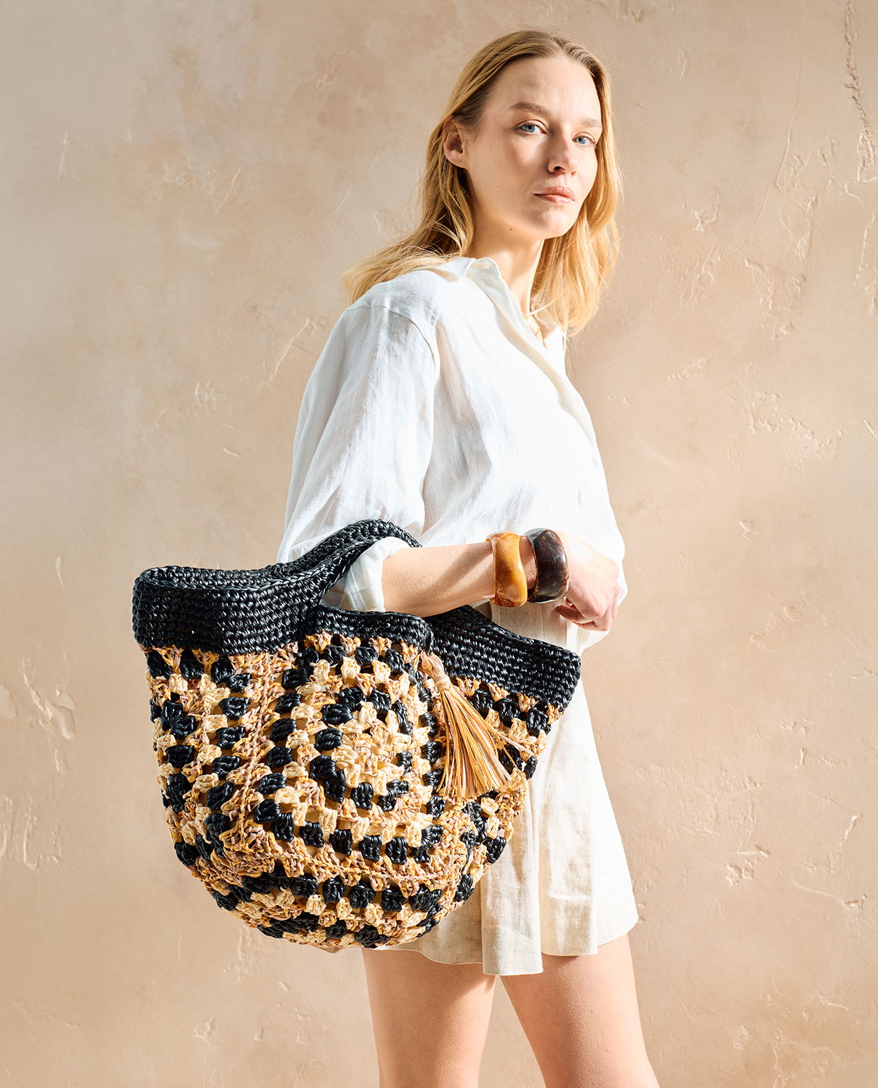 De tweekleurige tas Ninoe wordt met de haaktechniek opgebouwd uit individuele granny squares. Deze veelzijdige blokken vormen de basis van de tas en bieden de mogelijkheid om met verschillende kleurnuances te werken, wat het tweekleurige effect van de Ninoe benadrukt. De gehaakte hengsels zorgen voor een naadloze afwerking en dragen bij aan het authentieke handgemaakte karakter. Door de zorgvuldige combinatie van steken en de keuze voor twee complementaire garens ontstaat een stevige en tegelijkertijd soepele tas.