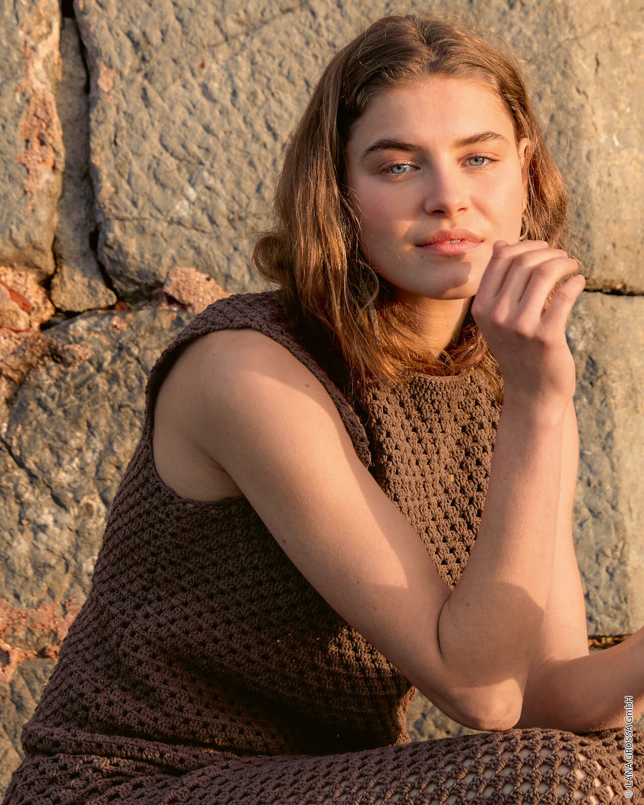 Lana Grossa Gioia is de ideale keuze voor dit zomerse project. Dit unieke garen combineert katoen met gerecyclede polyamide, wat resulteert in een duurzaam en aangenaam draagcomfort. De karakteristieke delicate crêpe-structuur zorgt ervoor dat je stekenbeeld altijd regelmatig en duidelijk is, zowel bij haken als bij breien.