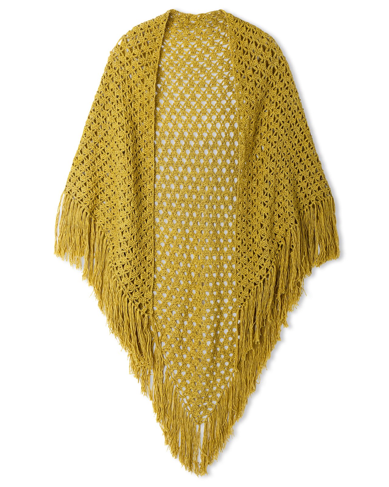 Ontdek het plezier van het haken van een unieke driehoekige omslagdoek. Dit is een stijlvolle accessoire met een verfijnd open haakwerk en speelse franjes, perfect om elke outfit een persoonlijke touch te geven. De ideale metgezel voor mildere dagen of als een elegante aanvulling op uw garderobe.