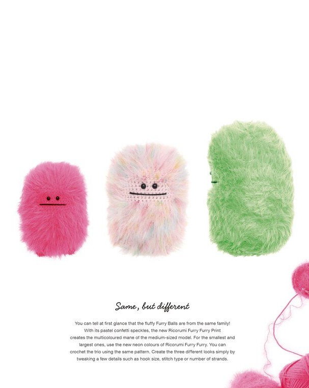 Voor deze 3 furry balls maken we gebruik van een harmonieuze combinatie van twee garens uit de Ricorumi collectie. Het