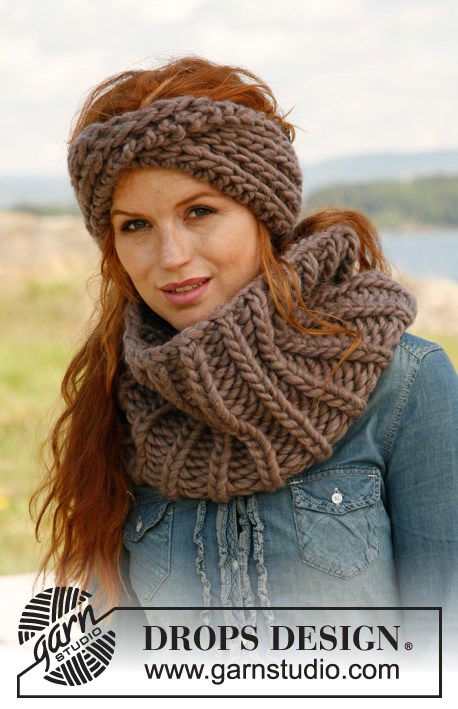 Gebreide DROPS hoofdband en halswarmer in Patentsteek van Polaris.
