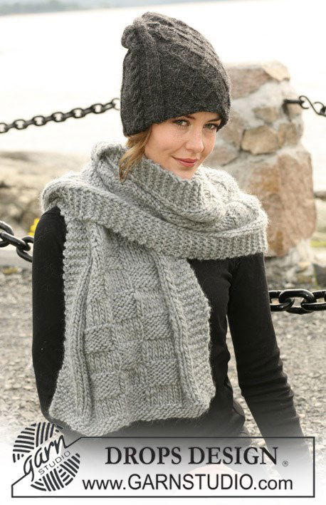 De set bestaat uit: DROPS Dubbele muts met kabels en boordst van 2 draden Alpaca en sjaal met structuurmotief van Eskimo .