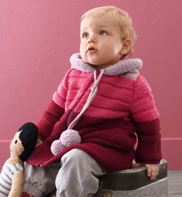Breipatroon warme veelkleurige mantel met super zachte capuchon en pompons, van het breigaren Partner 6 en Phil Douce van Phildar.