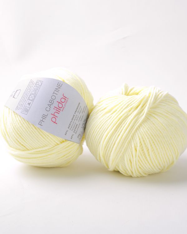 Cabotine van phildar is gemaakt van licht gebleekt katoen, dit geeft het garen een natuurlijke uitstraling. Daarnaast is voor meer elastisiteit acryl in de draad verwerkt. Het garen is zacht, stevig en geschikt om mee te haken en te breien. Cabotine is geschikt voor zowel zomer- als winterkleding, er staan veel patronen in de boeken van Phildar, een aantal patronen worden gratis bij het garen meegeleverd.
