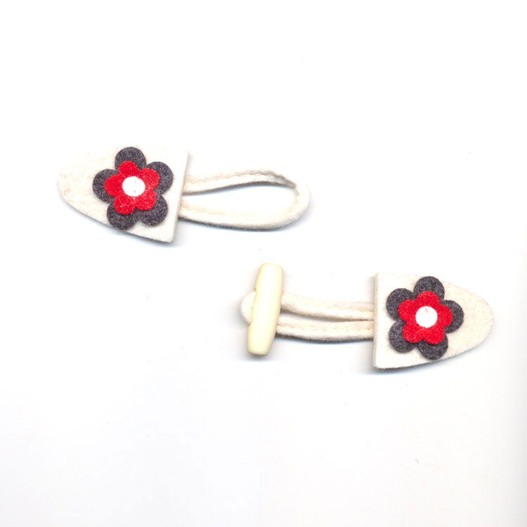 Houtje touwtje sluiting ecru in half ovaal met bloem antraciet, ecru met rood