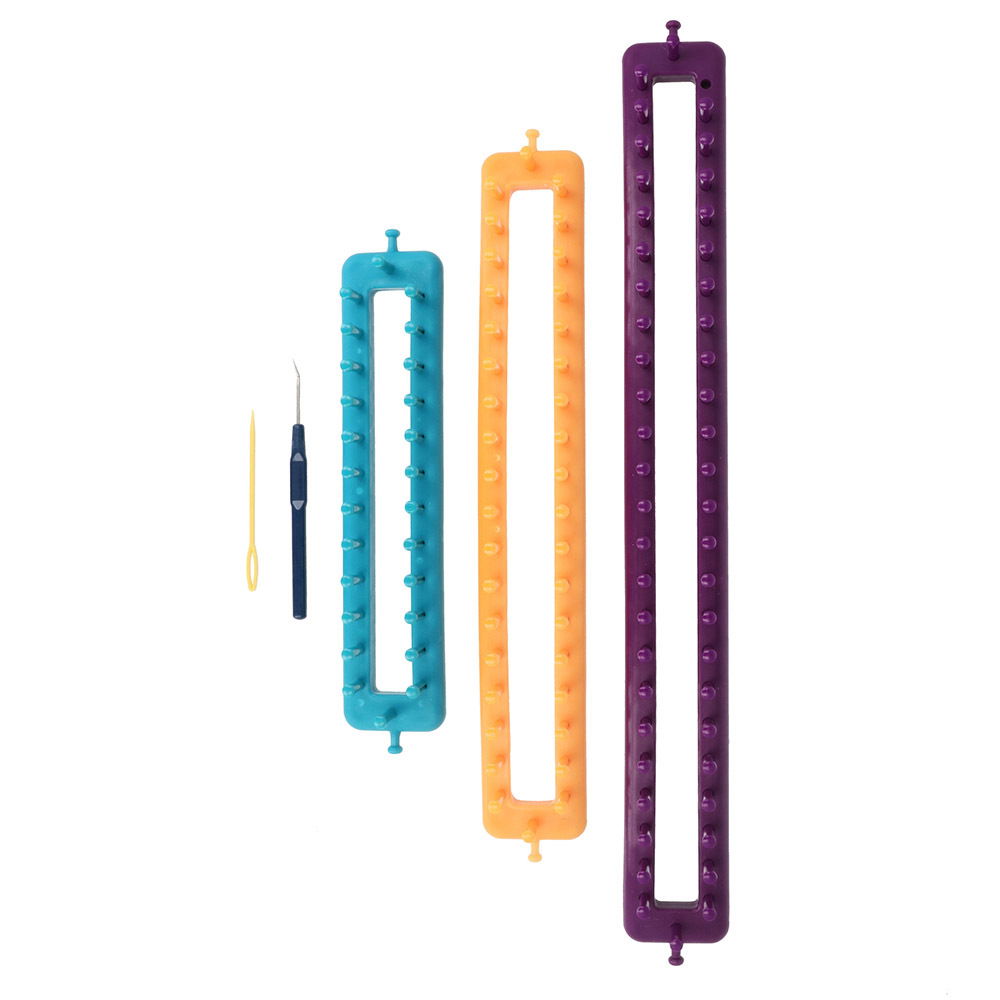 2 maten van de breilooms en breihaak, een handig hulpmiddel om de mooiste breiwerken te maken zonder de standaard breinaalden. Lengte looms : 18, 29 en 39 cm. De looms geven weer een nieuwe impuls aan dit traditionele handwerken. Net zoals bij het traditionele breien zijn er met de looms ook zeer veel verschillende steken mogelijk. In de loom zitten extra gaatjes waar de bijgeleverde pinnetjes in kunnen worden gezet. Zo kan er ook met dunnere garens op de looms worden gewerkt