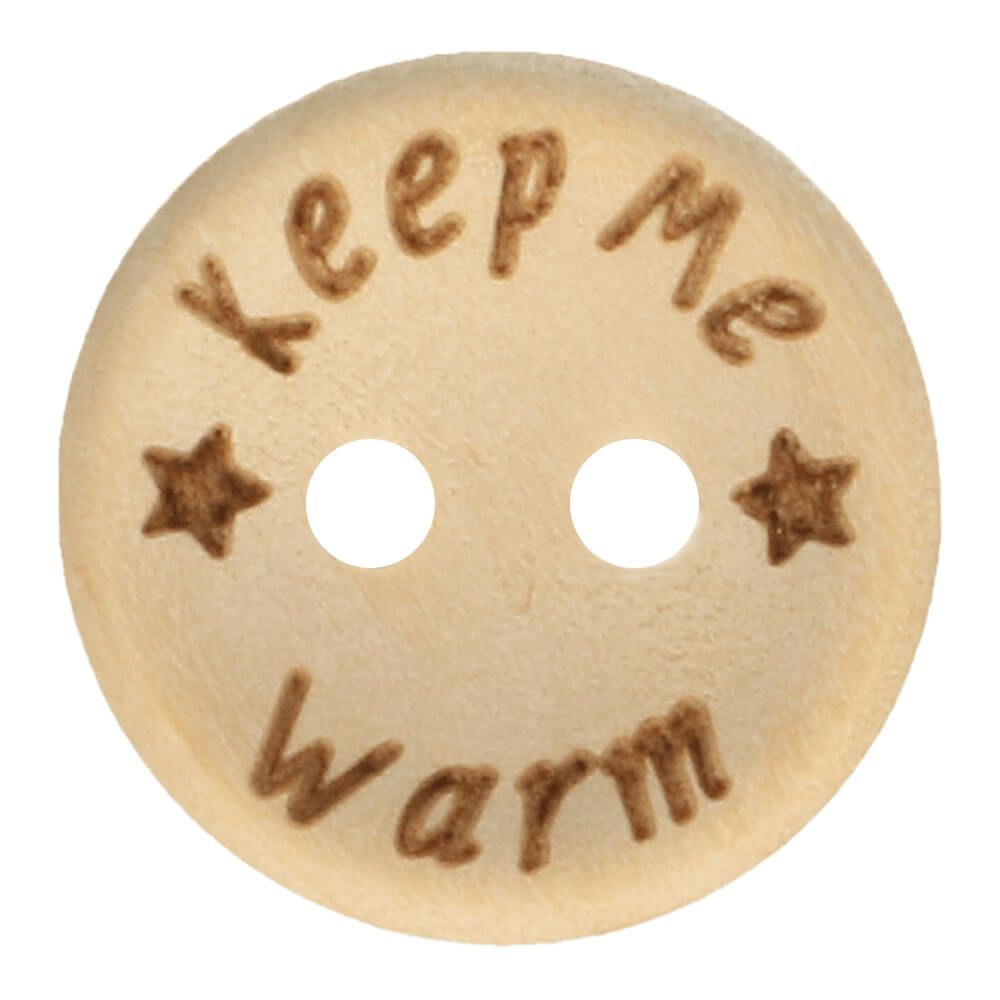 Natuurlijke knoop houtlook met tekst: keep me warm knoop rond met een doorsnee van 15 mm.