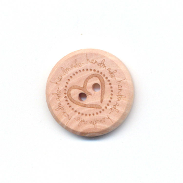 Natuurlijke knoop van licht hout met tekst: handmade, rond met een doorsnee van 25 mm.