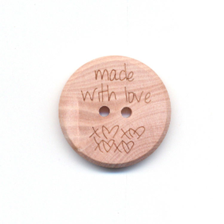Natuurlijke knoop van licht hout met tekst: made with loverond met een doorsnee van 20 mm.