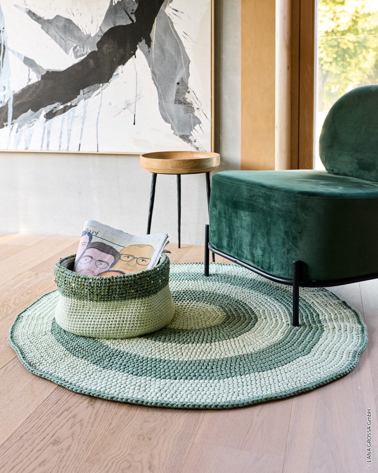 tweekleurig rond vloerkleed gemaakt van Lana Grossa The Tube