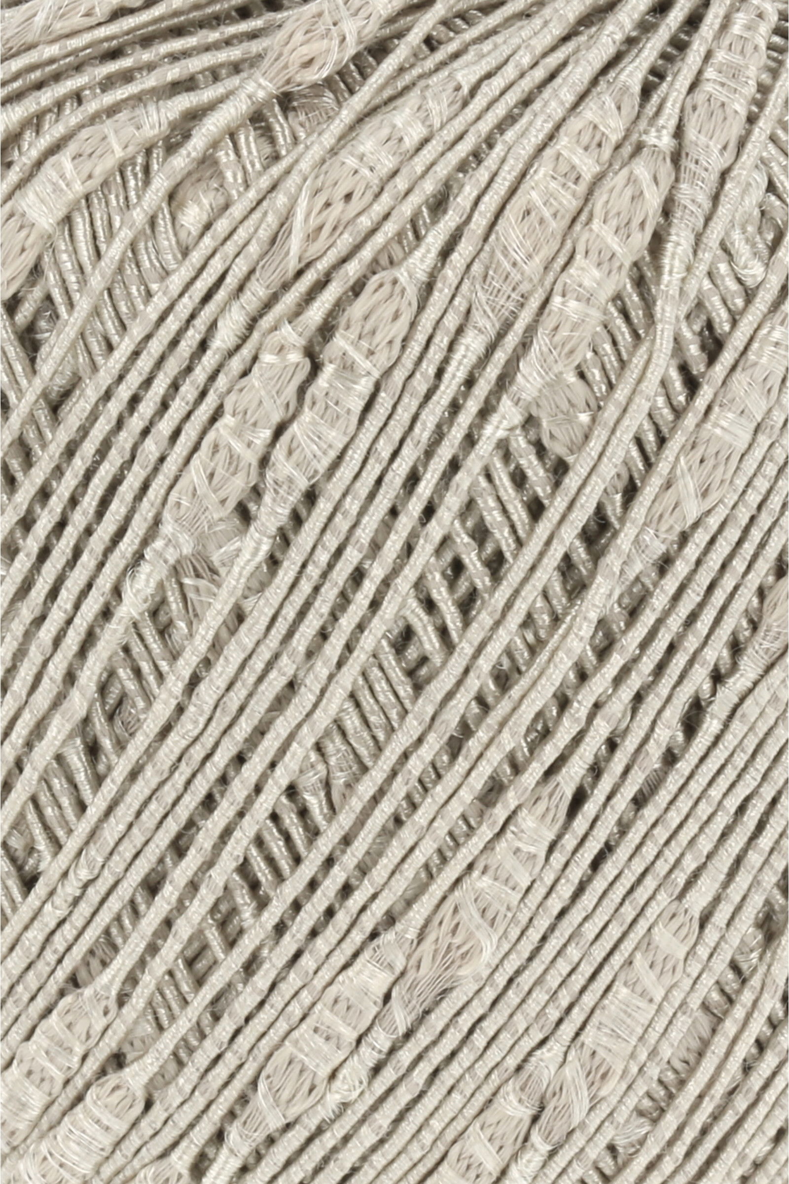 Lang Yarns Merlene is een dunne, glanzende draad met verspreid over de draad ronde, platte, verdikkingen van zo'n 8 mm.