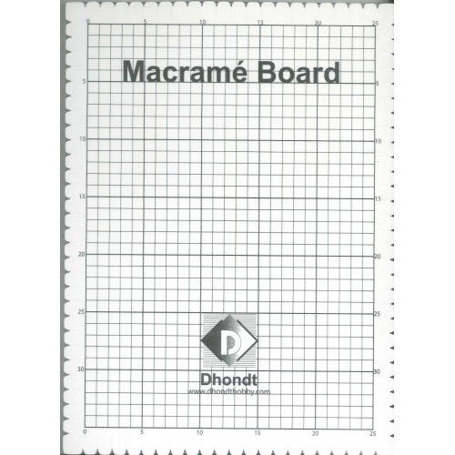 Macramebord heeft aan alle zijden inkepingen om het koord op zijn plaats te houden. Helpt een wirwar van het koord te voorkomen. De opdruk van een rooster in centimeters is handig om de juiste lengte te bepalen. Het bord is 39 a 29 cm. Het bord is gemaakt van elastische foam, waardoor verschillende diktes koord goed vastklemmen ook na gebruik van dikker koord.
