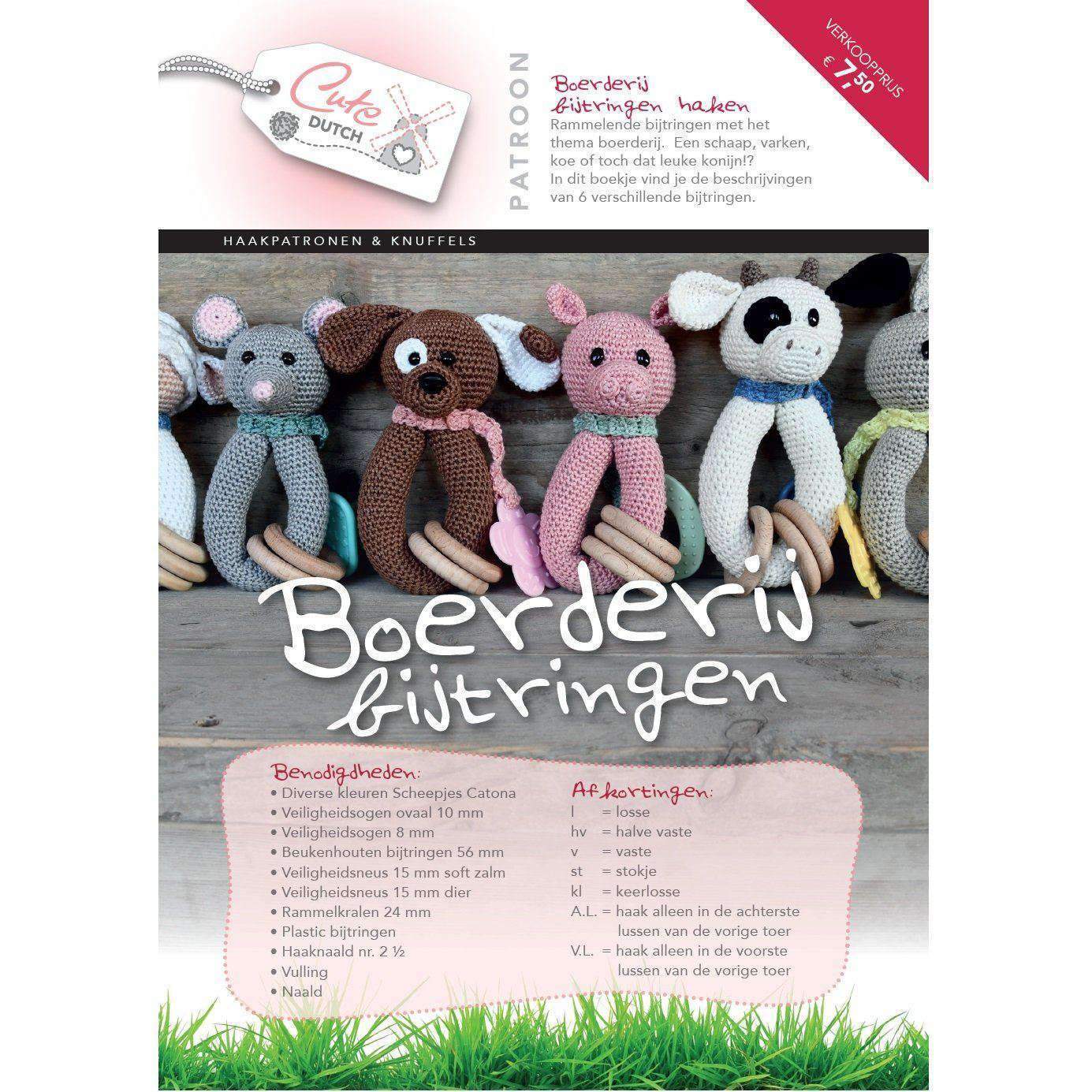 Haakpatroontjes voor het maken van een bijting met boerderijdieren: schaap, muis, hond, varken, koe en konijn