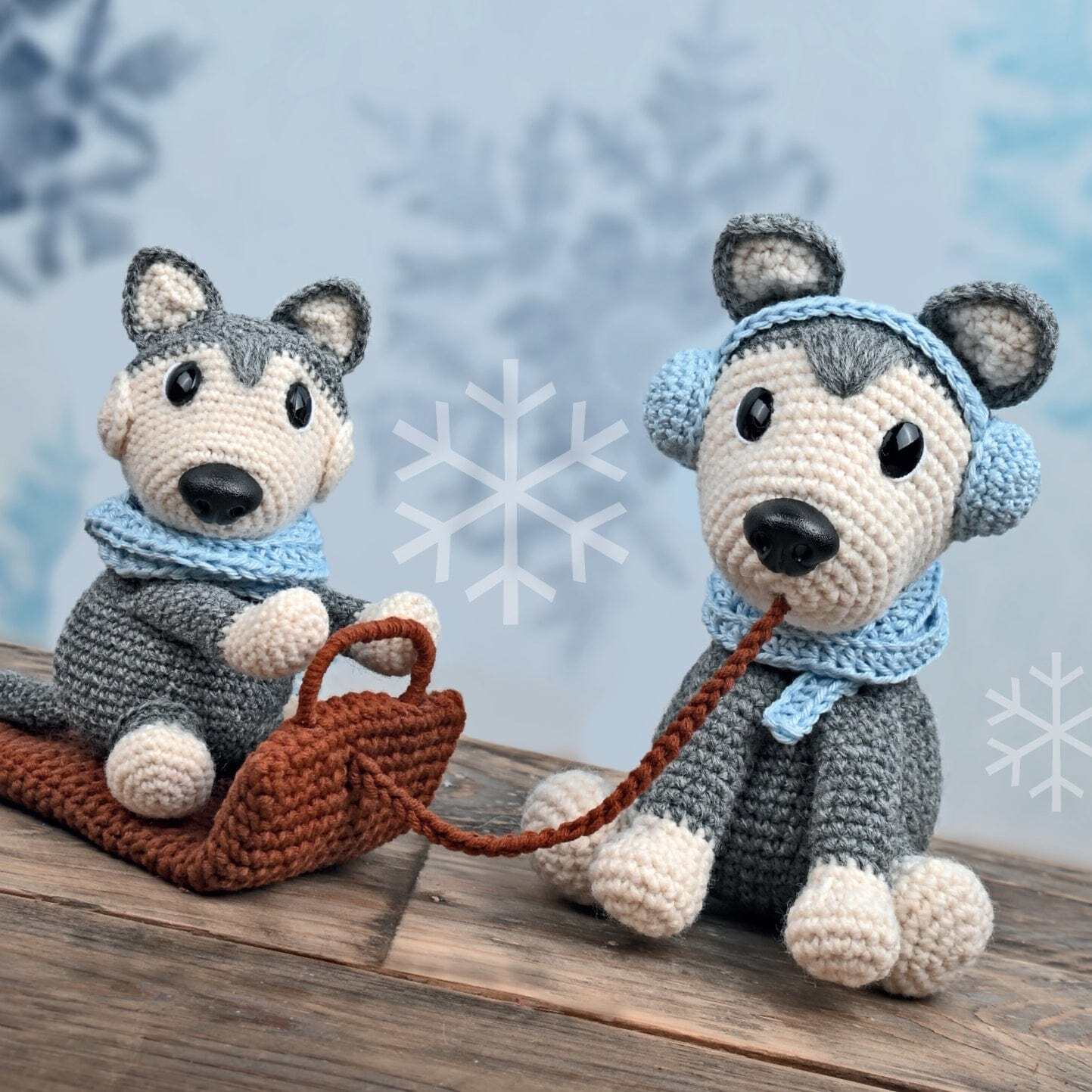 Haakpatroon Husky honden groot en klein, met slee, sjaal en oorwarmers.